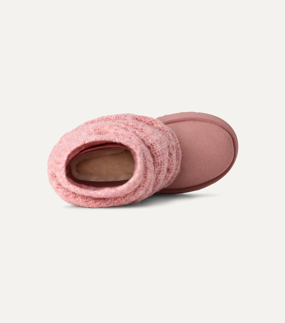 • Removable knit leg warmer, Neoprene shaft, Suede vamp, Suede heel counter, Rear pull tab made from 100% recycled polyester fibers